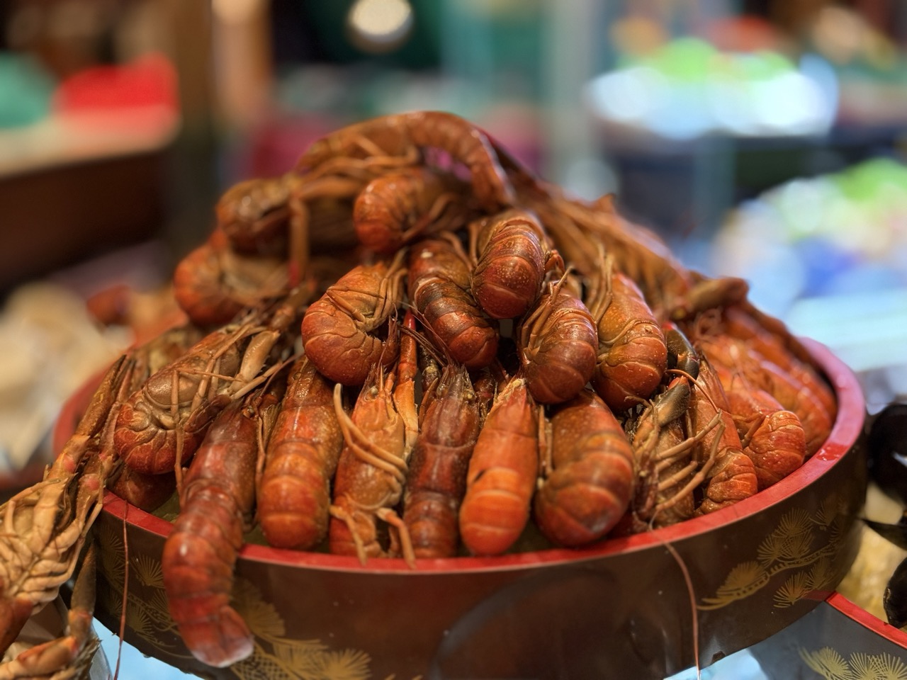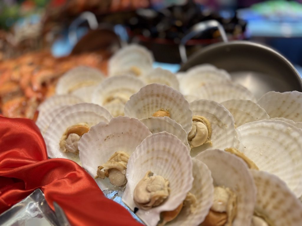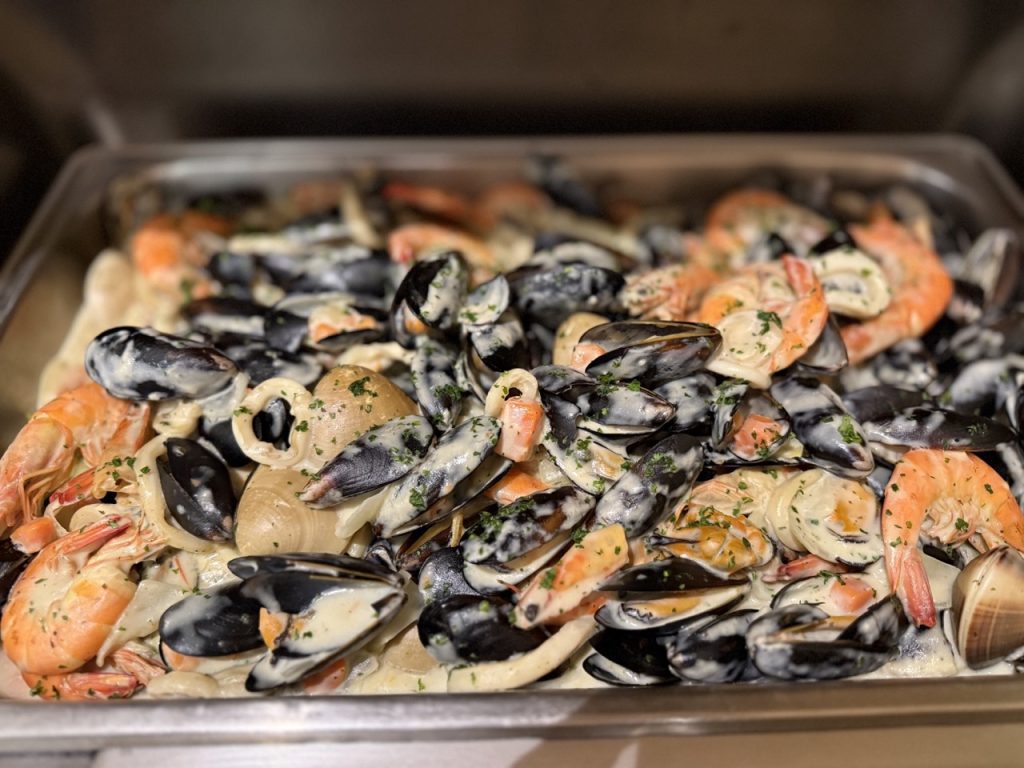 - Live Seafood Thermidor showcasing lobsters, scallops, and cream herb seafood